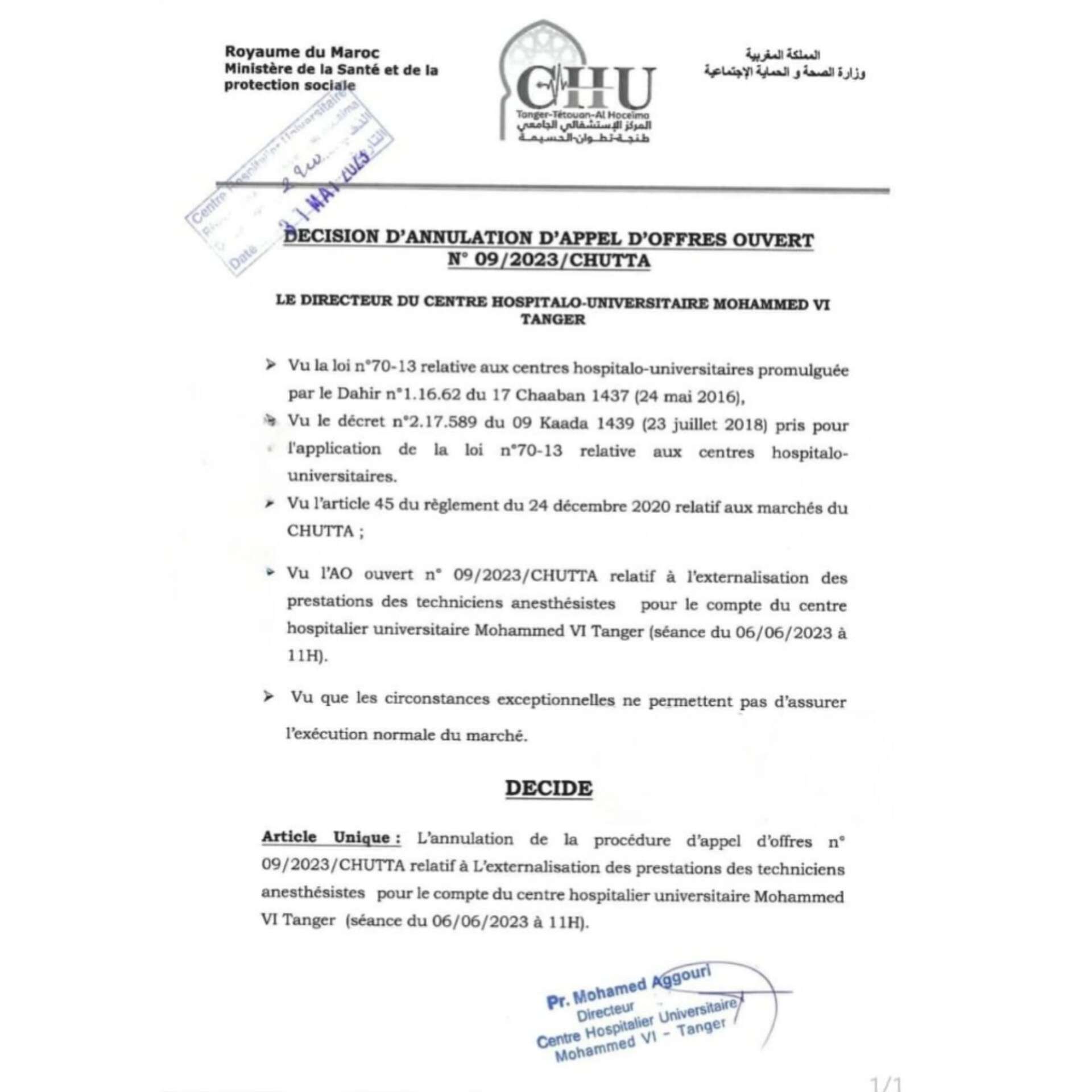 اضطرت إدارة المركز الاستشفائي الجامعي الجديد محمد السادس بمدينة طنجة، إلى إلغاء طلب عروض يخص تفويت خدمات تقنيي الإنعاش والتخدير، بعد احتجاجات ورفض نقابيين لهذه الخطوة.