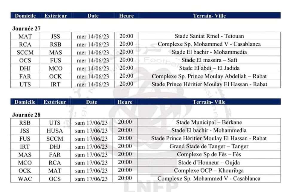أصدرت العصبة الوطنية لكرة القدم الاحترافية ،يومه الجمعة 9 يونيو 2023 بلاغا تعلن فيه ان عجلة البطولة الاحترافية ستعود للدوران، ابتداء من يوم الأربعاء 14 يونيو 2023 وذلك بإجراء الدورة 27 في حين ستبرمج الدورة 28 يوم السبت 17 يونيو 2023.