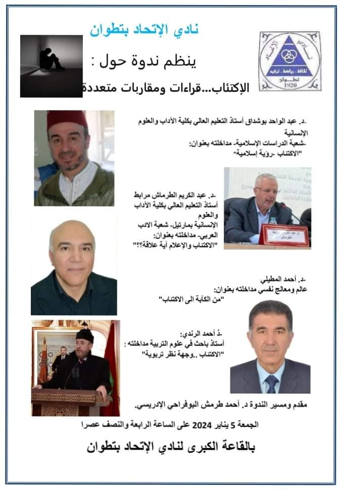 إحتضنت القاعة الكبرى لنادي الإتحاد بتطوان يوم الجمعة 5 يناير 2024 مساء ندوة علمية تربوية ثقافية ودينية حول موضوع “الاكتئاب..قراءات ومقاربات متعددة” من تنظيم مكتب نادي الإتحاد بتطوان برئاسة الأستاذ أحمد حجاج ومن تأطير الأستاذ أحمد الرندي والأستاذ عبد الواحد بوشداق والأستاذ عبد الكريم الطرماش مرابط، من تسيير وتقديم الدكتور أحمد الطرماش البوفراحي الإدريسي.