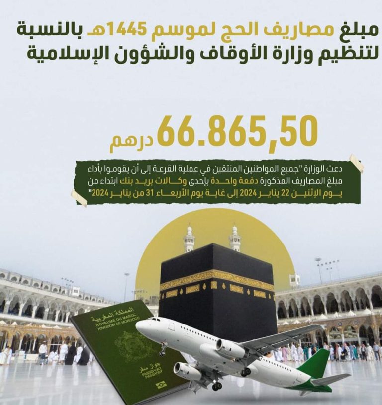 أفادت وزارة الأوقاف والشؤون الإسلامية بأن مبلغ مصاريف الحج لموسم 1445هـ بالنسبة لتنظيم وزارة الأوقاف والشؤون الإسلامية هو 66.865,50 درهما.