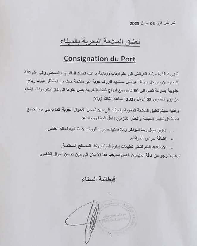 تنهي قبطانة ميناء العرائش الى علم ارباب وربابنة مراكب الصيد التقليدي والساحلي وإلى علم كافة البحارة ، أن سواحل مدينة العرائش ستشهد ظروف جوية غير ملائمة ، حيث من المنتظر هبوب رياح جنوبية قوية بسرعة تصل إلى 60 كلم/س ، مع امواج شمالية غربية يصل علوها إلى 04 امتار وذلك ابتداءا يومه الخميس 3\4\2025 .