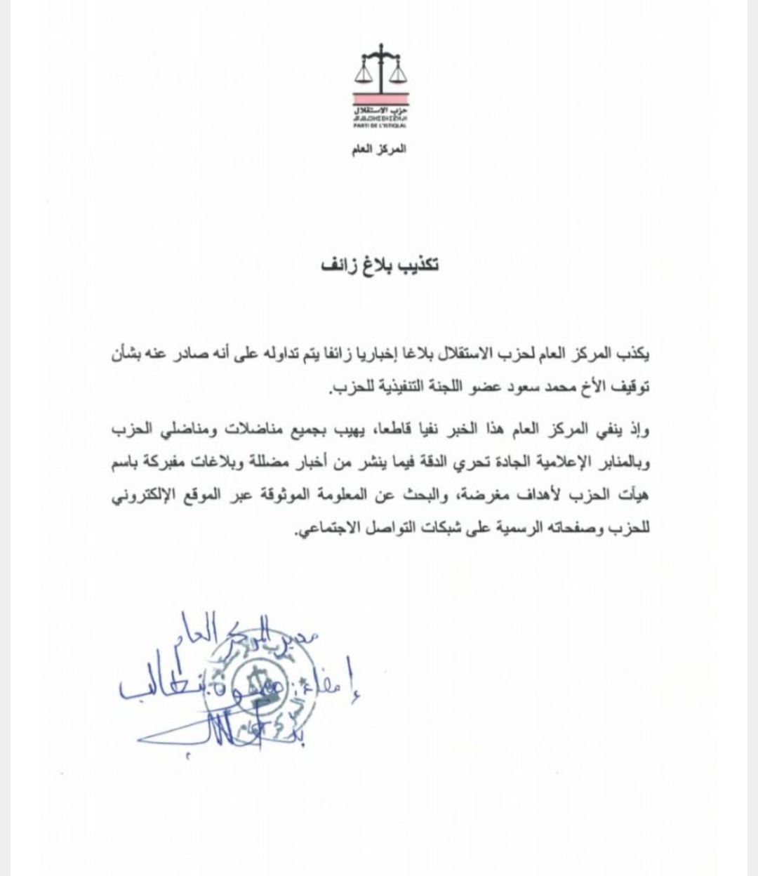 نفى المركز العام لحزب الاستقلال إصداره بلاغا أعلن فيه تجميد عضوية محمد سعود رئيس الفريق الاستقلالي بمحلس جهة طنجة تطوان الحسيمة.