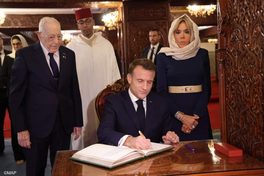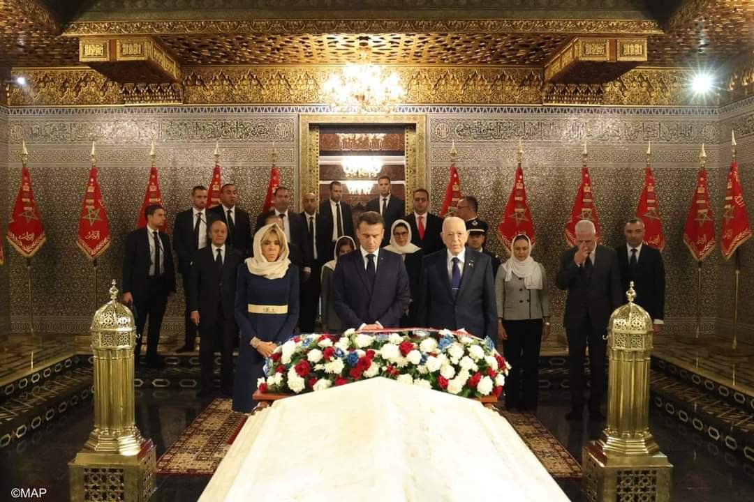 إثر ذلك، وقع إيمانويل ماكرون، وحرمه السيدة بريجيت ماكرون، في الدفتر الذهبي للضريح. ثم تسلم الرئيس الفرنسي كتابا عن تاريخ الضريح ودرع ضريح محمد الخامس.