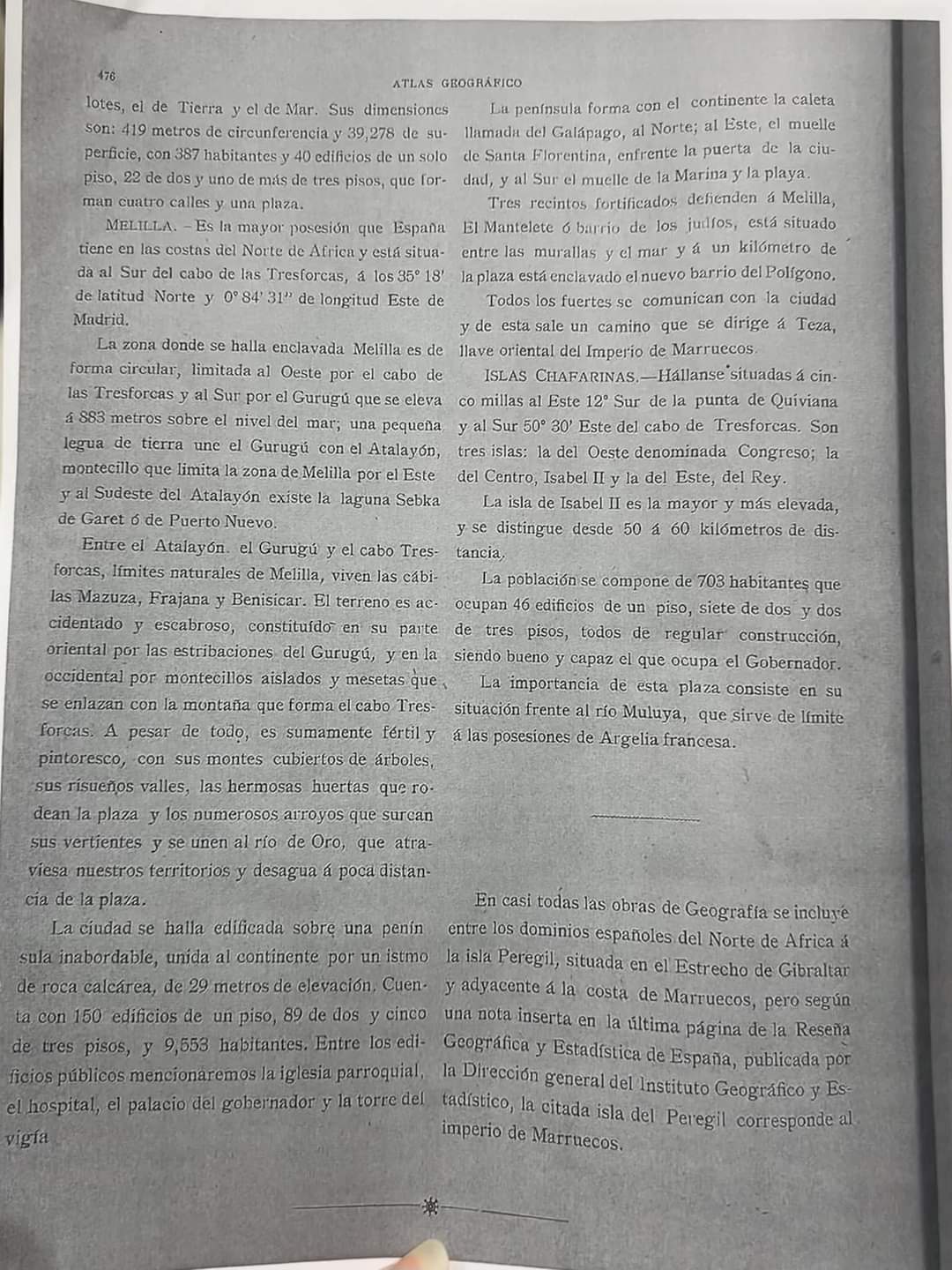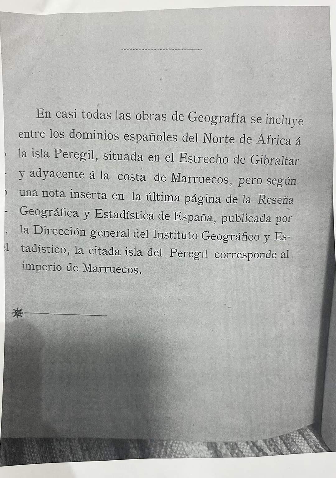 En la página 1.entre los islotes próximos a nuestra península, y como pertenecientes al territorio español. Se comprende el islote de perejil. Porque así lo consideran todos los geografía,pero con motivos de una incidente surgido a consecuencia de proyectar un faro en dicho islote,en la cesión del congreso de los diputados del día 3 de diciembre de 1887 .dijo el excmo.sr.ministro del estado entre otras cosa referente a este asunto lo siguiente :
