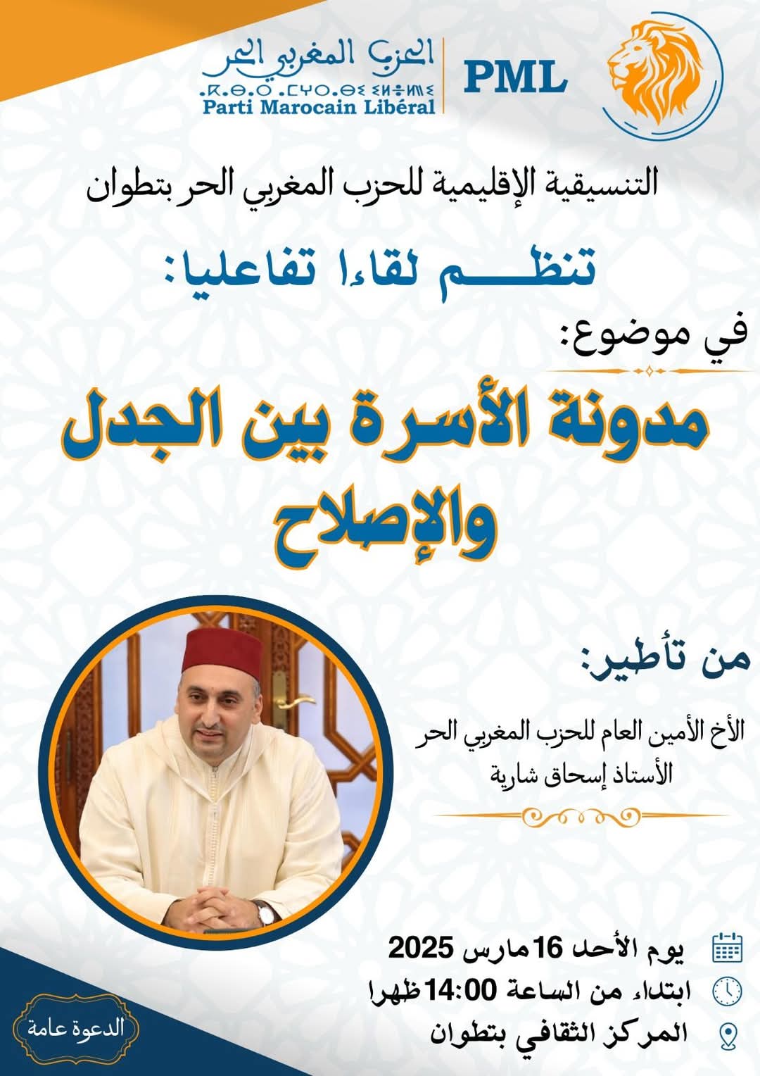 يظم الحزب المغربي الحر، تنسيقية تطوان، لقاءً تفاعليًا حول موضوع “مدونة الأسرة بين الجدل والإصلاح”، يوم الأحد 16 مارس 2025، في المركز الثقافي بتطوان.