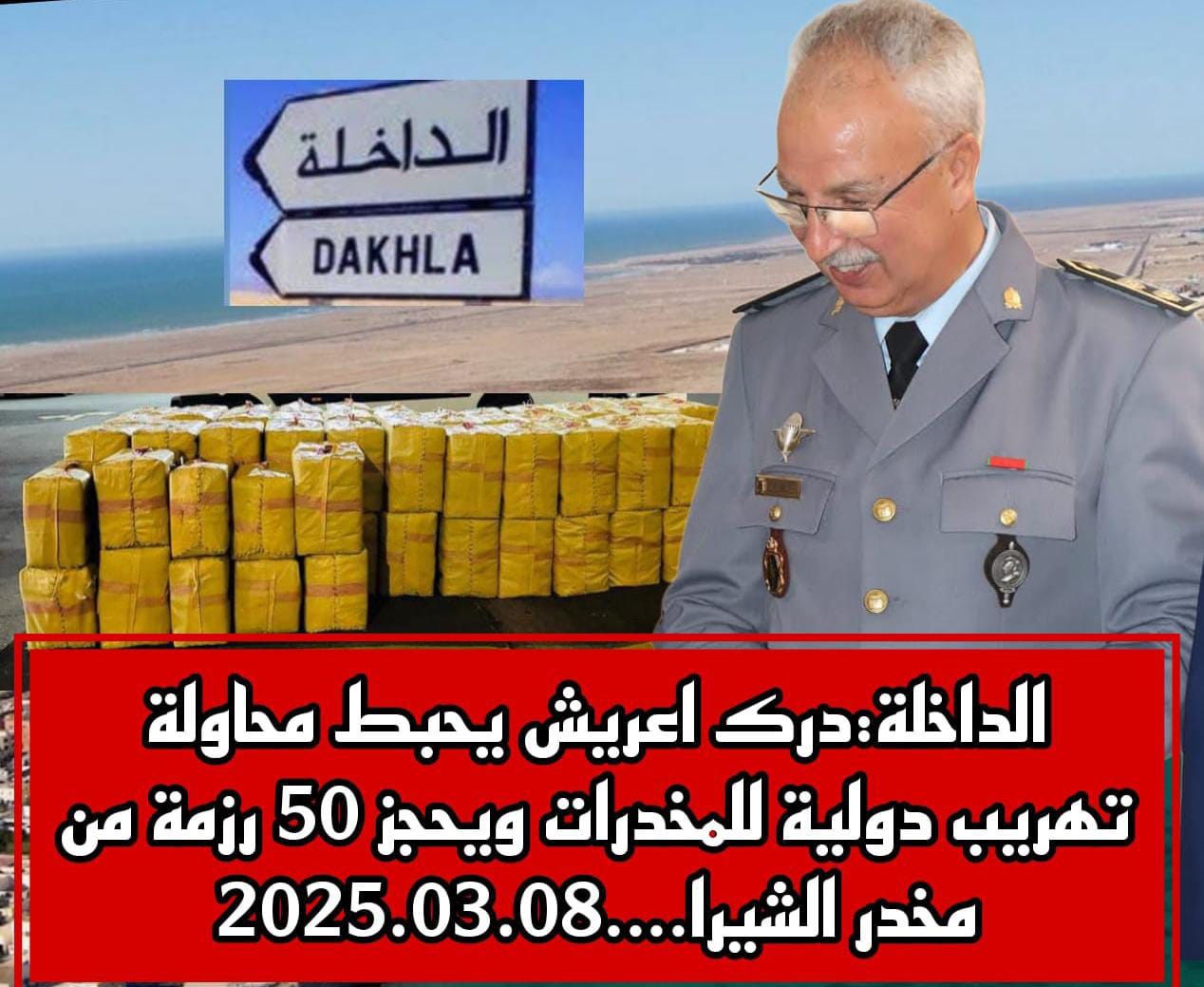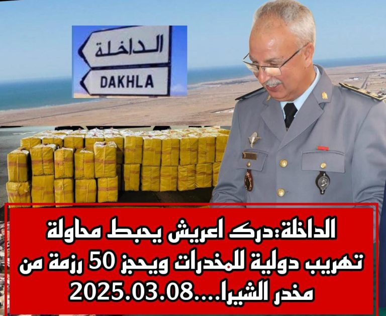 تمكنت عناصر الدرك الملكي بمركز اعريش التابع للقيادة الجهوية بالداخلة، تحت إشراف القائد الجهوي السيد حسن وليدي، من إحباط محاولة تهريب مخدرات فجر يوم السبت 08 مارس 2025 على شاطئ تماية شمال مدينة الداخلة، العملية استهدفت شبكة كانت تسعى لنقل كمية كبيرة من المخدرات عبر السواحل المغربية.