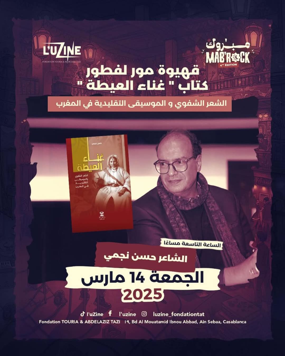 احتضن فضاء مؤسسة l’Uzine الثقافية، مساء الجمعة 14 مارس 2025، لقاءً ثقافيًا باذخًا بمناسبة توقيع كتاب “غناء العيطة” للدكتور حسن نجمي، أحد أبرز الباحثين في التراث الموسيقي المغربي.