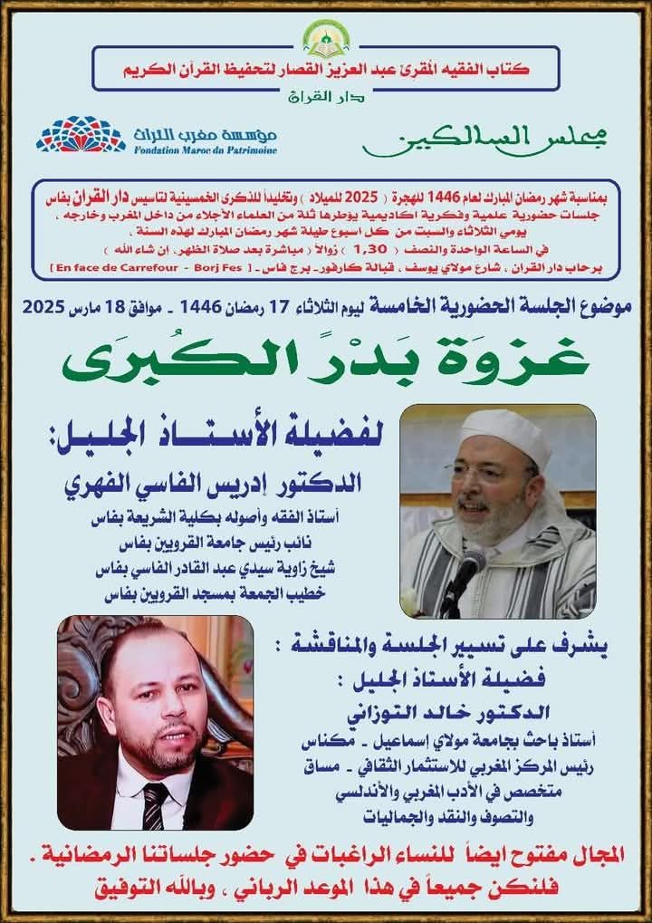 في إطار الفعاليات الرمضانية التي تنظمها دار القرآن بفاس، وبدعم من مؤسسة مغرب التراث، ستنعقد الجلسة الخامسة لمجلس السالكين يوم الثلاثاء 17 رمضان 1446 هـ (الموافق 18 مارس 2025 م)، والتي ستتناول موضوع “غزوة بدر الكبرى”، حيث سيلقى الدكتور إدريس الفاسي الفهري محاضرة قيمة حول هذا الحدث التاريخي المفصلي في الإسلام.