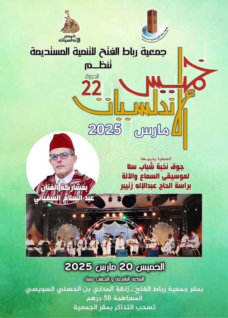 تنظم جمعية رباط الفتح للتنمية المستديمة الدورة الثانية والعشرين من “خميس الأندلسيات”، وذلك يوم الخميس 20 مارس 2025، بمقر الجمعية بزنقة المدني بن الحسني السويسي.