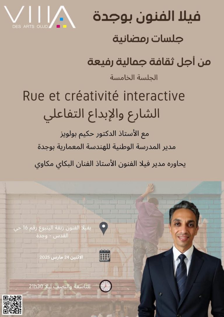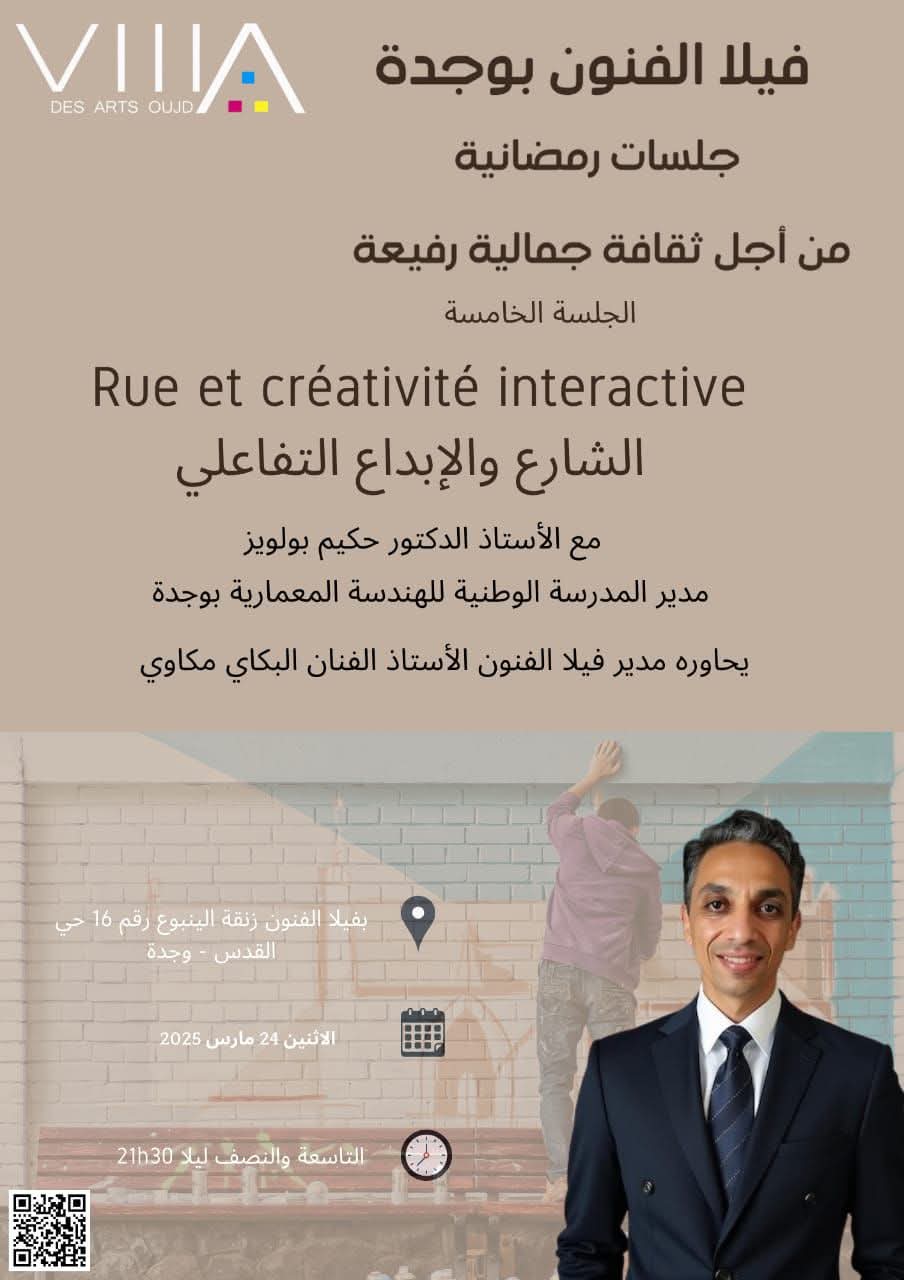 تستمر فعاليات الجلسات الرمضانية بفيلا الفنون وجدة، حيث سيكون عشاق الفنون والثقافة على موعد مع الجلسة الخامسة التي ستتناول موضوع “الصورة وعلاقتها بالشارع كمكون أساسي في الهندسة المعمارية، وعلاقتها بالإبداع التفاعلي”، وذلك يوم الاثنين 24 مارس الجاري على الساعة التاسعة والنصف مساءً.