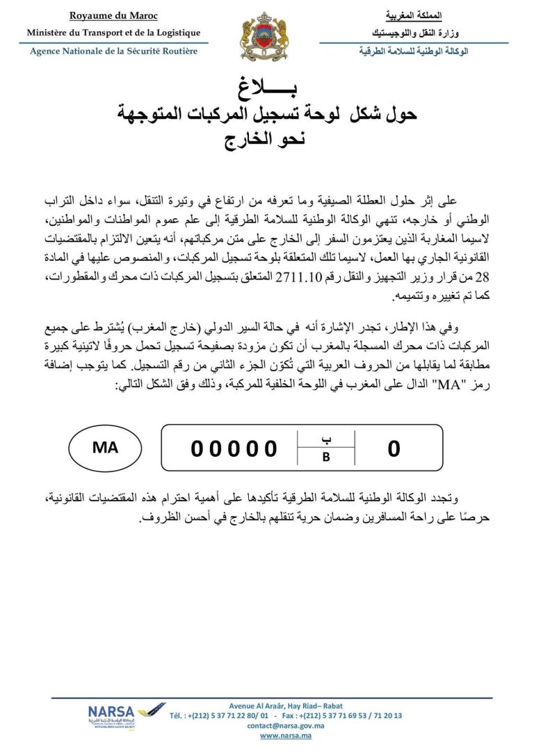 أصدرت الوكالة الوطنية للسلامة الطرقية (NARSA) بلاغاً توضيحياً بشأن الشكل القانوني الواجب توفره في لوحات تسجيل المركبات المغربية الموجهة نحو الخارج، وذلك تزامناً مع موسم العطلة الصيفية الذي يعرف ارتفاعاً ملحوظاً في حركة تنقل المواطنين داخل وخارج أرض الوطن.
