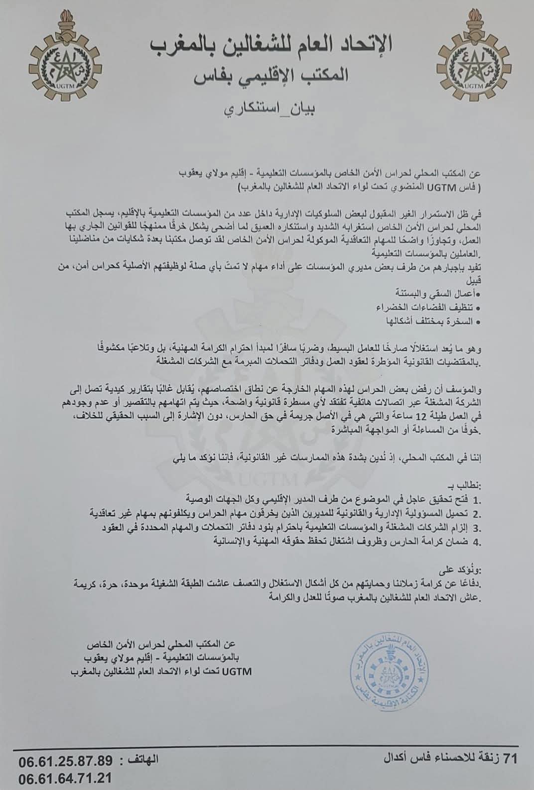 يذكر أن قضية حراس الأمن الخاص بالمؤسسات التعليمية باتت من الملفات المطروحة على الساحة النقابية، في ظل تنامي مؤشرات هشاشة الشغل، وتزايد شكاوى العاملين من التهميش وسوء المعاملة وغياب الرقابة الجدية على مدى التزام المتدخلين باحترام المقتضيات القانونية والتنظيمية.
