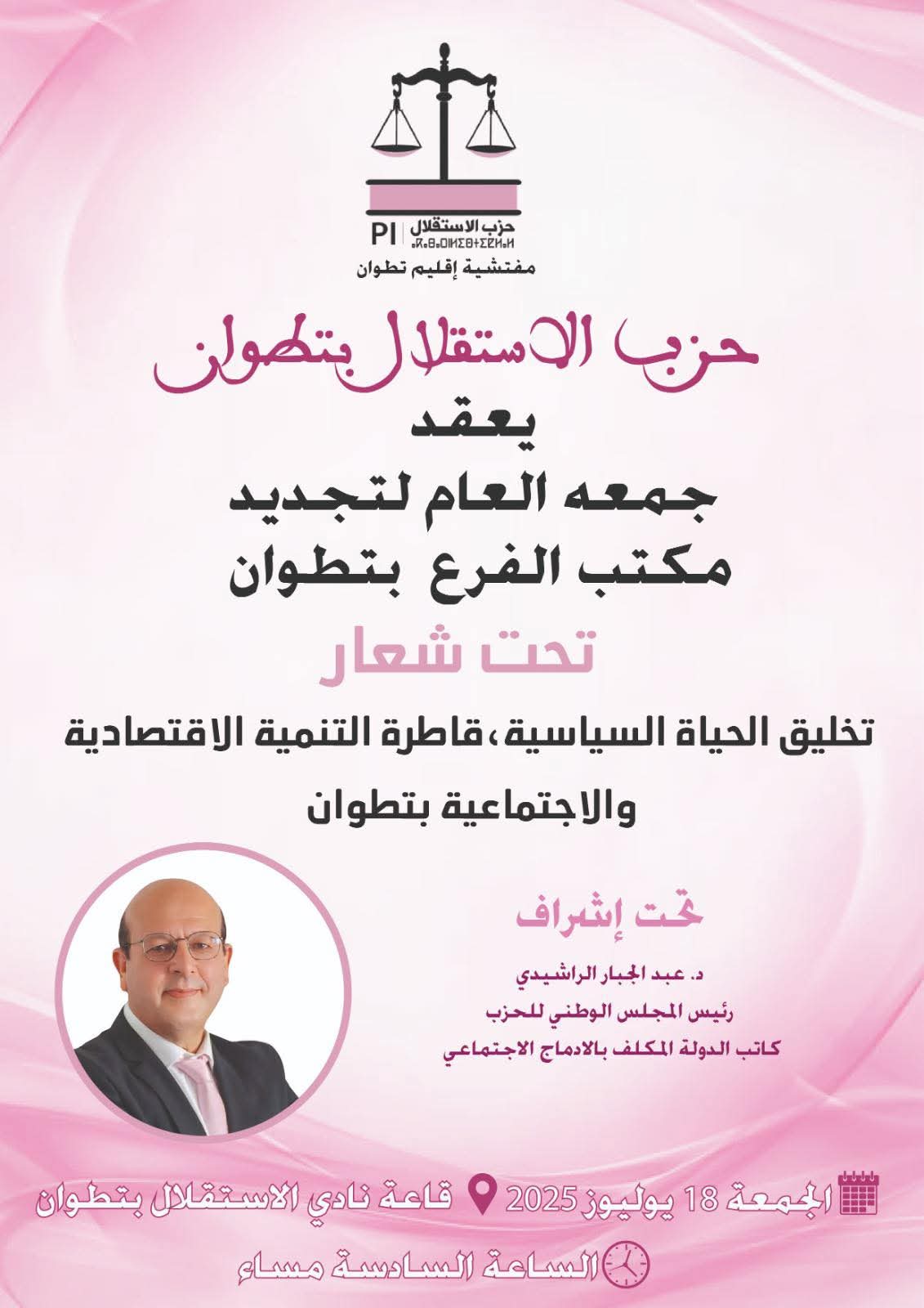 في إطار الدينامية التنظيمية التي يعرفها حزب الاستقلال، تعقد مفتشية الحزب بإقليم تطوان جمعها العام لتجديد مكتب الفرع المحلي، وذلك يوم الجمعة 18 يوليوز 2025 على الساعة السادسة مساءً بـقاعة نادي الاستقلال بتطوان.