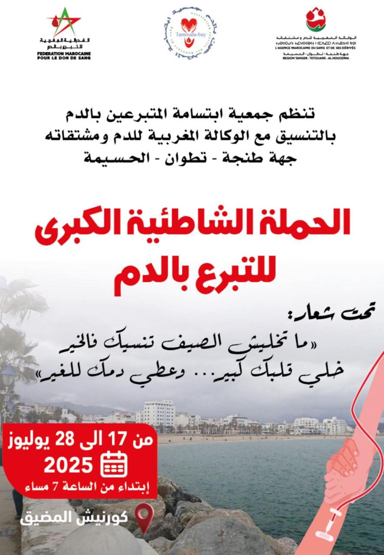 في إطار جهودها الرامية إلى ترسيخ ثقافة التبرع بالدم، تنظم جمعية “ابتسامة المتبرعين بالدم” بشراكة مع الوكالة المغربية للدم ومشتقاته الحملة الشاطئية الكبرى للتبرع بالدم وذلك على مستوى كورنيش مدينة المضيق، ابتداء من يوم 17 إلى غاية 28 يوليوز 2025، كل يوم انطلاقا من الساعة السابعة مساء