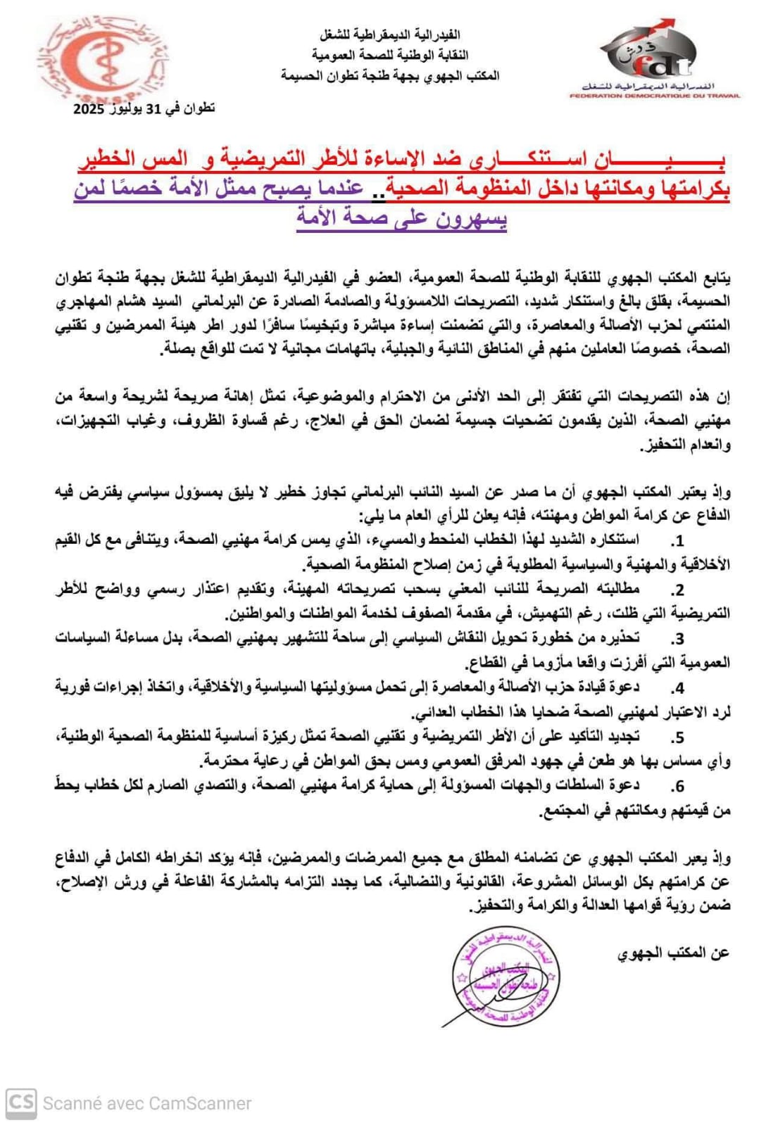 يتابع المكتب الجهوي للنقابة الوطنية للصحة العمومية، العضو في الفيدرالية الديمقراطية للشغل بجهة طنجة تطوان الحسيمة، بقلق بالغ واستنكار شديد، التصريحات اللامسؤولة والصادمة الصادرة عن البرلماني السيد هشام المهاجري المنتمي لحزب الأصالة والمعاصرة، والتي تضمنت إساءة مباشرة وتبخيسًا سافرًا لدور اطر هيئة الممرضين و تقنيي الصحة، خصوصًا العاملين منهم في المناطق النائية والجبلية، باتهامات مجانية لا تمت للواقع بصلة.