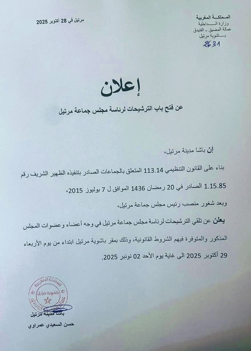 بعد القرار الذي أفضى إلى عزل الرئيس مراد امنيول من رئاسة مجلس جماعة مرتيل، دخلت المدينة مرحلة جديدة من الترقب السياسي والإداري، خصوصًا بعد أن أعلنت باشوية مرتيل رسميًا عن فتح باب الترشيحات لمنصب رئيس المجلس الجماعي ابتداءً من يوم الأربعاء 29 أكتوبر 2025 إلى غاية الأحد 2 نونبر 2025، وفقًا للقانون التنظيمي رقم 113.14 المتعلق بالجماعات الترابية.
