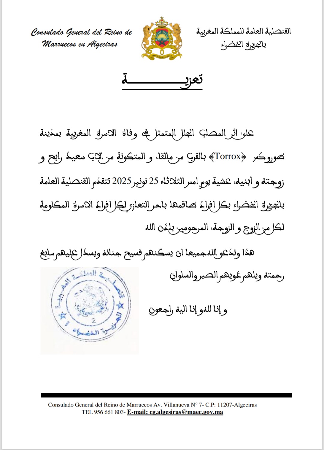 أصدرت القنصلية العامة للمملكة المغربية بالجزيرة الخضراء بيان تعزية وذلك إثر الحادث المأساوي الذي ألمّ بأسرة مغربية مقيمة بمدينة توروكس (Torrox) التابعة لإقليم مالقة بجنوب إسبانيا، والذي أسفر عن وفاة ربّ الأسرة السيد رابح سعيد، إلى جانب زوجته وابنيه ، وذلك مساء يوم الثلاثاء 25 نونبر 2025.