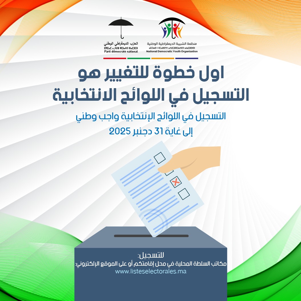 في خطوة تعكس وعيًا متزايدًا بأهمية المشاركة السياسية للشباب، دعت شبيبة الحزب الديمقراطي الوطني جميع المواطنات والمواطنين—وخاصة فئة الشباب—إلى المبادرة بالتسجيل في اللوائح الانتخابية، بعدما أعلنت وزارة الداخلية عن فتح فترة التسجيل ابتداءً من 1 دجنبر إلى غاية 31 منه.