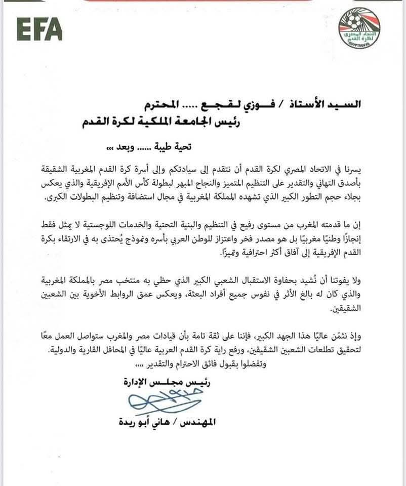 وجاء في الرسالة، الموقعة من طرف رئيس مجلس إدارة الاتحاد المصري لكرة القدم، المهندس هاني أبو ريدة، أن المغرب قدّم نموذجاً مشرفاً في احتضان التظاهرات الرياضية الكبرى، وهو ما يعكس حجم التطور الذي تشهده المملكة في مجال استضافة وتنظيم البطولات القارية والدولية، بما ينسجم مع المعايير الاحترافية المعتمدة عالمياً.