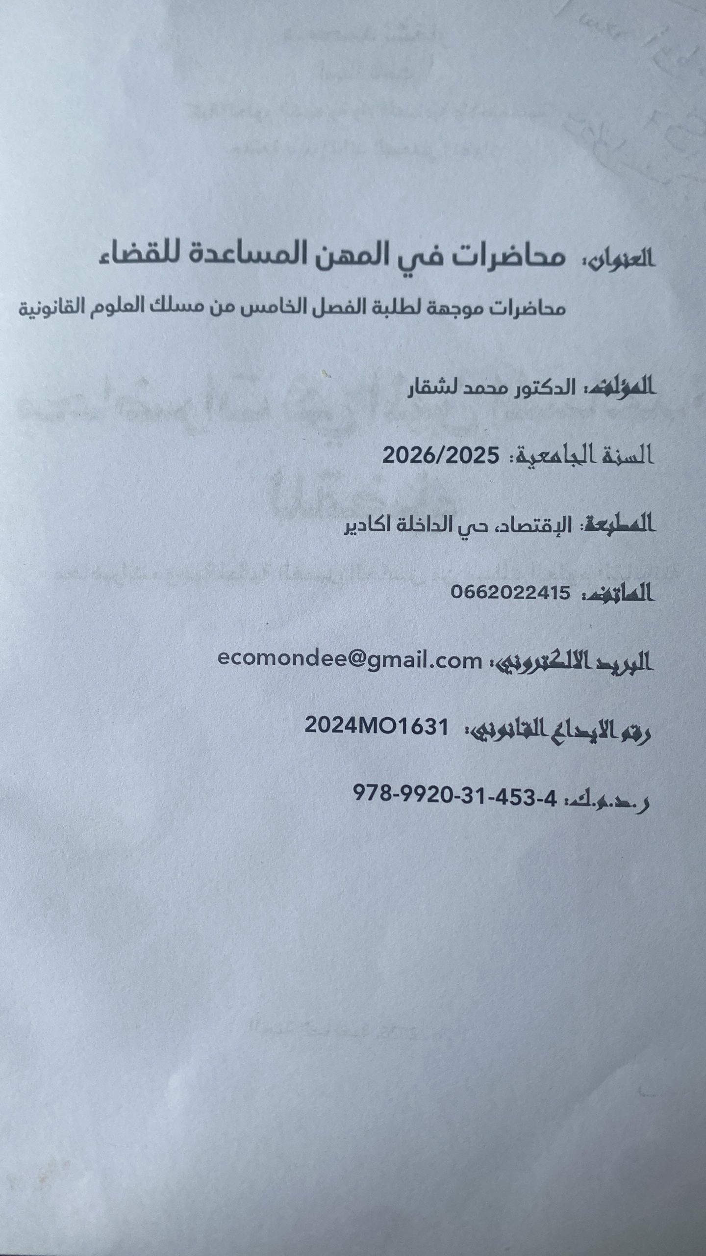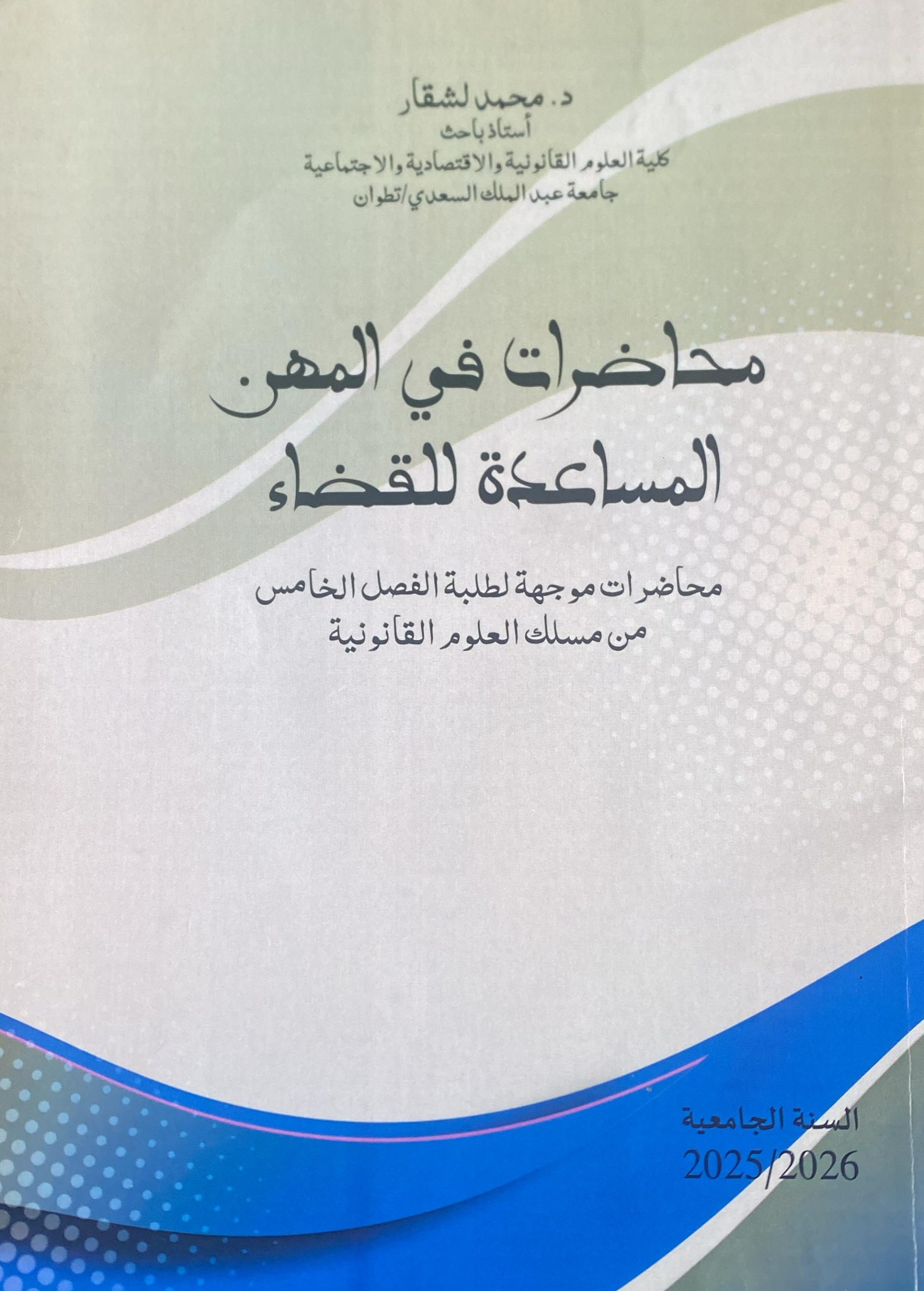 صدر كتاب “محاضرات في المهن المساعدة للقضاء” للدكتور محمد لشقار، – أستاذ التعليم العالي بكلية العلوم القانونية والاقتصادية والاجتماعية بتطوان -، برسم السنة الجامعية 2025/2026، موجّهًا لطلبة الاجازة والماستر من مسلك العلوم القانونية، تخصص: القانون الخاص.