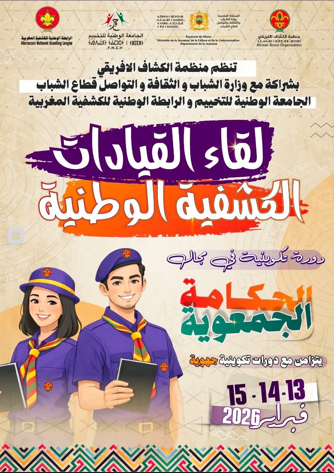 تنظم منظمة الكشاف الإفريقي، بشراكة مع وزارة الشباب والثقافة والتواصل – قطاع الشباب، والجامعة الوطنية للتخييم، والرابطة الوطنية للكشفية المغربية، اللقاء الوطني للقيادات الكشفية حول موضوع الحكامة الجمعوية، وذلك أيام 13 و14 و15 فبراير 2026، بمشاركة قيادات تمثل مختلف جهات المملكة.