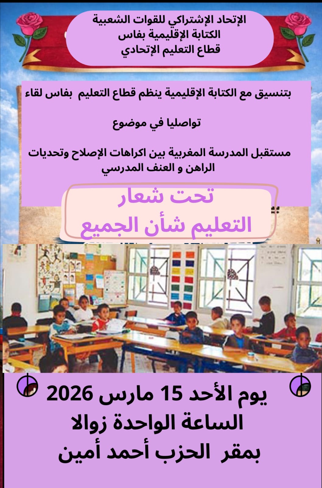 وأعلنت الكتابة الإقليمية لحزب الاتحاد الاشتراكي للقوات الشعبية بفاس، بتنسيق مع قطاعات الحزبي، عن تنظيم لقاء تواصلي يوم الأحد 15 مارس 2026 على الساعة الواحدة زوالًا، وذلك بمقر الحزب أحمد أمين، لمناقشة موضوع: “مستقبل المدرسة المغربية بين إكراهات الإصلاح وتحديات العنف المدرسي”.