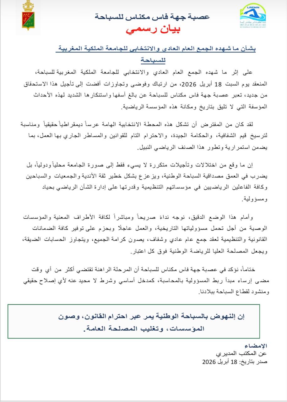 عصبة جهة فاس مكناس للسباحة دخلت على الخط بموقف رسمي عبّرت من خلاله عن انشغالها إزاء مآل التحضيرات المرتبطة بالجمع العام العادي والانتخابي المقرر في 18 أبريل 2026، معتبرة أن ما جرى لا يمكن قراءته بمعزل عن اختلالات قانونية وتنظيمية رافقت المسار منذ بدايته، قبل أن تتفاقم حدتها وتفضي إلى تجميده أو تأجيله.