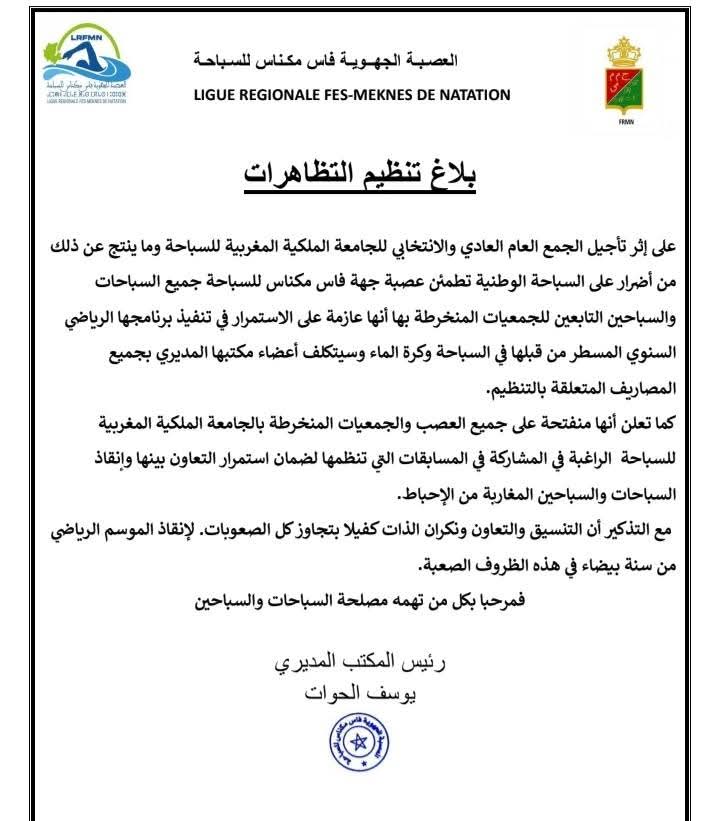 البلاغ، الذي وقعه رئيس المكتب المديري يوسف الحوات، حمل رسائل واضحة تطمئن الأندية والجمعيات المنخرطة وكافة السباحات والسباحين بأن العصبة عازمة على مواصلة تنفيذ برنامجها الرياضي السنوي المسطر سلفًا، وعدم السماح للظروف التنظيمية الطارئة بأن تتحول إلى عائق أمام تطور الممارسة الرياضية أو سبب في ضياع موسم كامل من التحضير والتنافس.